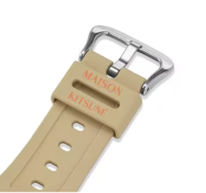 โลโก้แบรนด์: ห่วงรัดสาย (Band Loop) และฝาหลัง (Case Back) ถูกประทับด้วยโลโก้ของ Maison Kitsuné เพื่อยืนยันถึงการเป็นนาฬิการุ่นพิเศษที่เกิดจากความร่วมมือครั้งสำคัญนี้